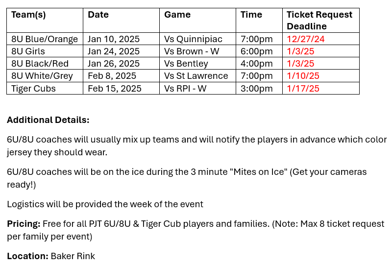 Pricing: Free for all PJT 10 U, 12 U, and 14 U players and families. (Note: Max 8 ticket request per family). Tickets will be emailed the week of the event.